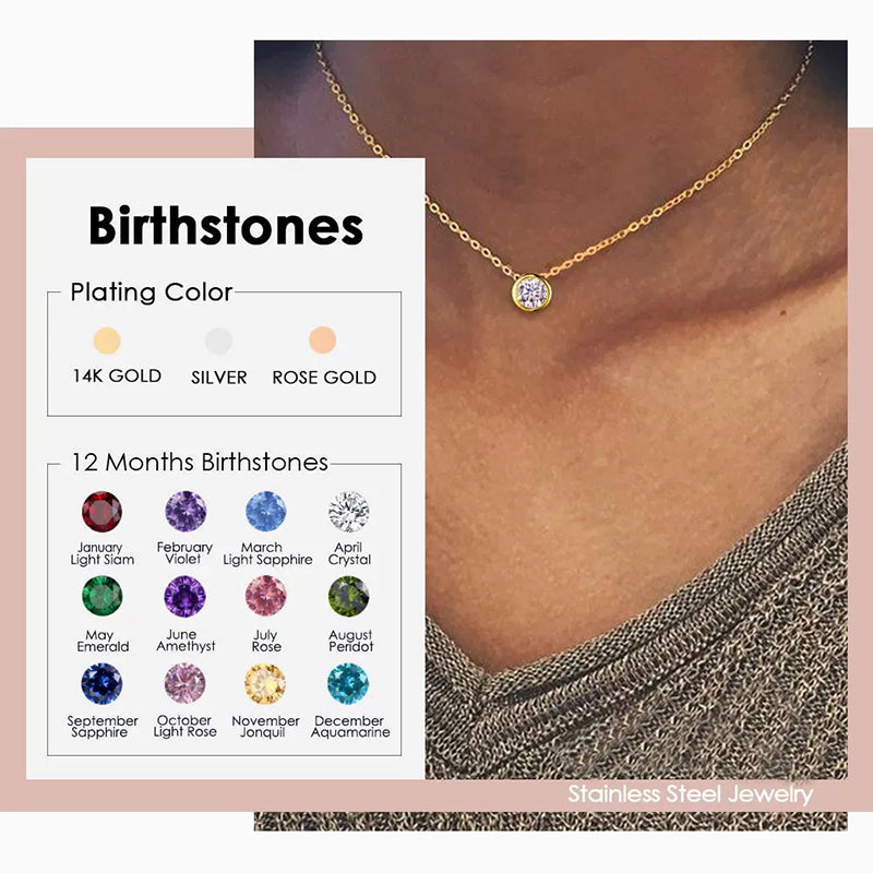 Each necklace features a round birthstone pendant, symbolizing one of the twelve birth months — a timeless expression of love, identity, and celebration.