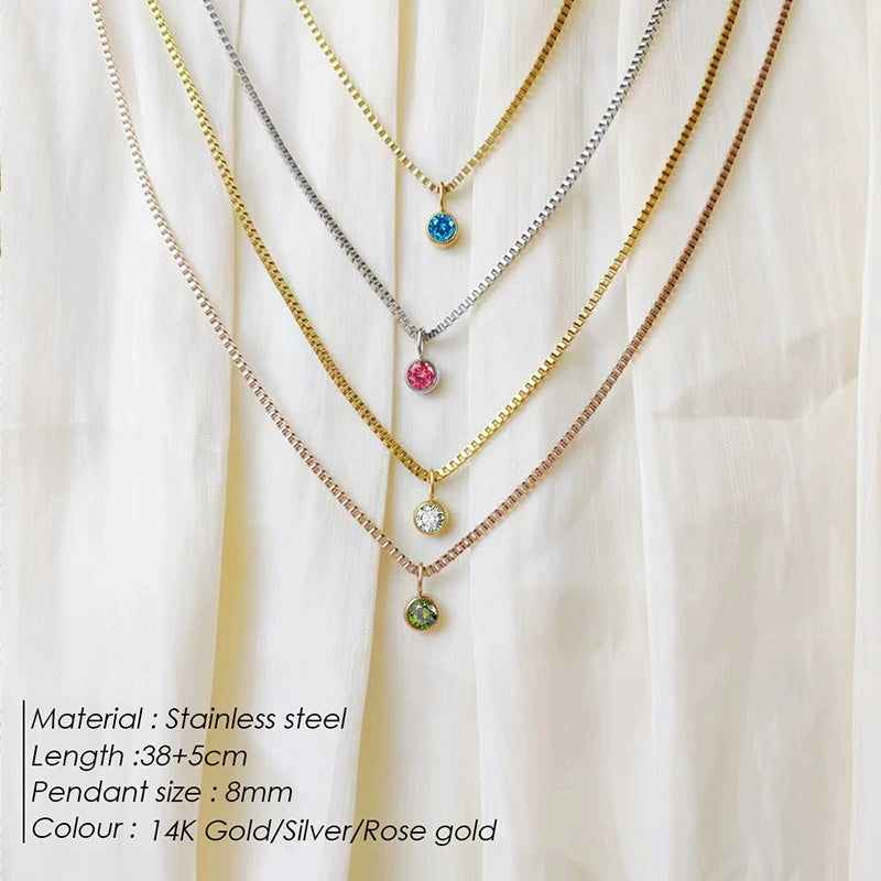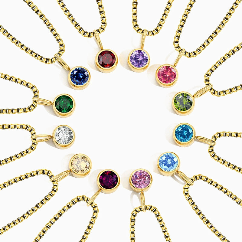 Each necklace features a round birthstone pendant, symbolizing one of the twelve birth months — a timeless expression of love, identity, and celebration.